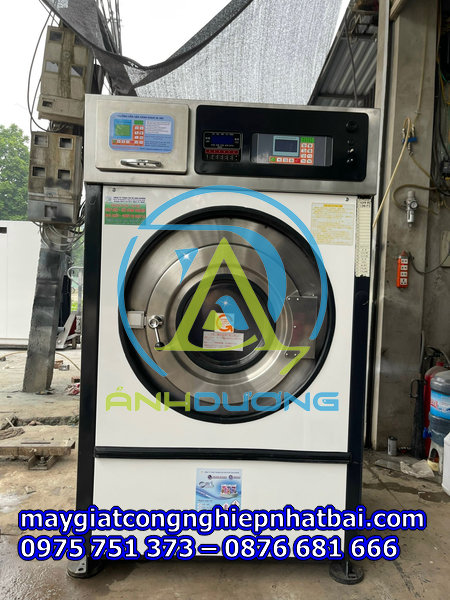 - Thông thường, máy có công suất phổ biến từ 16kg đến 30kg hoặc cao hơn, phù hợp với nhiều mô hình kinh doanh khác nhau. Thiết bị được cấu tạo với lồng giặt inox chống gỉ, khung máy chắc chắn và hệ thống điều khiển tự động, giúp máy hoạt động bền bỉ trong thời gian dài.